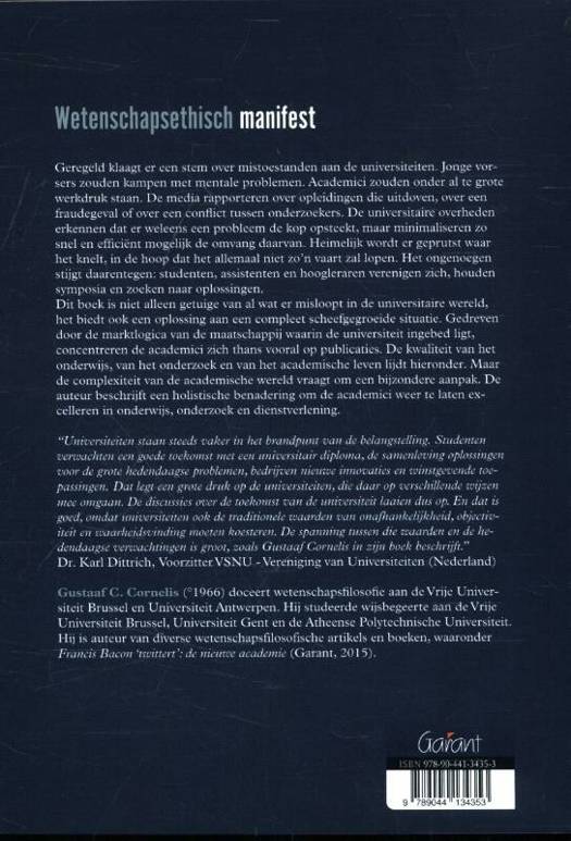 Geregeld klaagt er een stem over mistoestanden aan de universiteiten. Jonge vorsers zouden kampen met mentale problemen. Academici zouden onder al te grote werkdruk staan. De media rapporteren over opleidingen die uitdoven, over een fraudegeval of over een conflict tussen onderzoekers. De universitaire overheden erkennen dat er weleens een probleem de kop opsteekt, maar minimaliseren zo snel en efficiënt mogelijk de omvang daarvan. Heimelijk wordt er geprutst waar het knelt, in de hoop dat het allemaal niet zo’n vaart zal lopen. Het ongenoegen stijgt daarentegen: studenten, assistenten en hoogleraren verenigen zich, houden symposia en zoeken naar oplossingen. Dit boek is niet alleen getuige van al wat er misloopt in de universitaire wereld, het biedt ook een oplossing aan een compleet scheefgegroeide situatie. Gedreven door de marktlogica van de maatschappij waarin de universiteit ingebed ligt, concentreren de academici zich thans vooral op publicaties. De kwaliteit van het onderwijs, van het onderzoek en van het academische leven lijdt hieronder. Maar de complexiteit van de academische wereld vraagt om een bijzondere aanpak. De auteur beschrijft een holistische benadering om de academici weer te laten excelleren in onderwijs, onderzoek en dienstverlening. “Universiteiten staan steeds vaker in het brandpunt van de belangstelling. Studenten verwachten een goede toekomst met een universitair diploma, de samenleving oplossingen voor de grote hedendaagse problemen, bedrijven nieuwe innovaties en winstgevende toepassingen. Dat legt een grote druk op de universiteiten, die daar op verschillende wijzen mee omgaan. De discussies over de toekomst van de universiteit laaien dus op. En dat is goed, omdat universiteiten ook de traditionele waarden van onafhankelijkheid, objectiviteit en waarheidsvinding moeten koesteren. De spanning tussen die waarden en de hedendaagse verwachtingen is groot, zoals Gustaaf Cornelis in zijn boek beschrijft.” Dr. Karl Dittrich, Voorzitter VSNU - Vereniging van Universiteiten (Nederland)