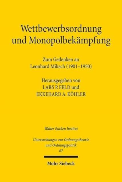 English summary: The essays collected in this volume discuss the life and work of the Freiburg economist Leonhard Miksch with a special focus on his contributions to the ordoliberal approach to monetary and competition policy. Furthermore this volume contains reprints of some of Miksch's articles as well as a curriculum vitae and a bibliography of Leonhard Miksch. German description: Leonhard Miksch (1901 - 1950) ist eine vielschichtige Personlichkeit innerhalb der Grundungsgeneration der Freiburger Schule. Als Schuler Walter Euckens avancierte er zum engen wirtschaftspolitischen Berater Ludwig Erhards und war massgeblich an der Entstehung der Sozialen Marktwirtschaft beteiligt. Dieser Band liefert einen Einblick in sein Leben und Werk sowie eine Diskussion seiner wichtigsten Beitrage zur Freiburger Forschungstradition. Sie wurden anlasslich seines 60. Todestages im September 2010 von Uwe Dathe, Nils Goldschmidt, Wernhard Moschel und Ekkehard A. Kohler am Walter Eucken Institut vorgestellt. In einem zweiten Teil werden einige wissenschaftliche Beitrage und Zeitschriftenartikel von Leonhard Miksch abgedruckt. Mit einer Einleitung von Lars P. Feld und Ekkehard A. Kohler sowie Bildtafeln, Faksimiles und einer Bibliographie liefert dieser Band eine erste historische Aufarbeitung des Werks von Leonhard Miksch innerhalb der Freiburger Forschungstradition.