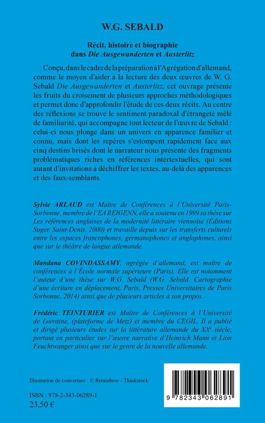 Conçu dans le cadre de la préparation à l'Agrégation d'allemand, comme le moyen d'aider à la lecture des deux uvres de W. G. Sebald Die Ausgewanderten et Austerlitz, cet ouvrage présente les fruits du croisement de plusieurs approches méthodologiques et permet donc d'approfondir l'étude de ces deux récits. Au centre des réflexions se trouve le sentiment paradoxal d'étrangeté mêlé de familiarité, qui accompagne tout lecteur de l'uvre de Sebald.
