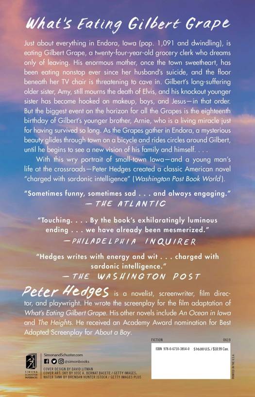 Just about everything in Endora, Iowa (pop. 1,091 and dwindling) is eating Gilbert Grape, a twenty-four-year-old grocery clerk who dreams only of leaving. His enormous mother, once the town sweetheart, has been eating nonstop ever since her husband's suicide, and the floor beneath her TV chair is threatening to cave in. Gilbert's long-suffering older sister, Amy, still mourns the death of Elvis, and his knockout younger sister has become hooked on makeup, boys, and Jesus -- in that order. But the biggest event on the horizon for all the Grapes is the eighteenth birthday of Gilbert's younger brother, Arnie, who is a living miracle just for having survived so long. As the Grapes gather in Endora, a mysterious beauty glides through town on a bicycle and rides circles around Gilbert, until he begins to see a new vision of his family and himself.... With this wry portrait of small-town Iowa -- and a young man's life at the crossroads -- Peter Hedges created a classic American novel "charged with sardonic intelligence" (Washington Post Book World).