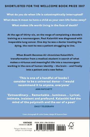 When Breath Becomes Air chronicles Kalanithi's transformation from a medical student asking what makes a virtuous and meaningful life into a neurosurgeon working in the core of human identity - the brain - and finally into a patient and a new father. What makes life worth living in the face of death?