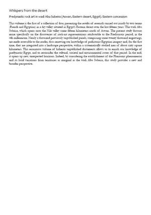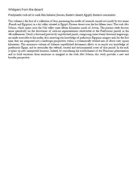 This volume is the first of a collection of four presenting the results of research carried out jointly by two teams (French and Egyptian) in a dry valley situated in Egypt’s Eastern desert over the last fifteen years: The wadi Abu Subeira, which opens onto the Nile valley some fifteen kilometers north of Aswan. The present study focuses more specifically on the discoveries of rock-art representations attributable to the Predynastic period, in the 4th millennium. Nearly a thousand previously unpublished panels, comprising some twenty thousand engravings, are made accessible to the reader, thus renewing our knowledge of prehistoric Egyptian imagery and, for the first time, they are integrated into a landscape perspective, within a systematically studied area of about sixty square kilometers. This enormous volume of hitherto unpublished documents allows us to enrich our knowledge of predynastic Egypt, and to reconsider the cultural, societal and environmental issues of that period. In the end, it opens up new, unexpected horizons. Indeed, by considering the establishment of the Pharaonic phenomenon and its local variations from territories as marginal as the wadi Abu Subeira, this study provides a new and broader perspective.
