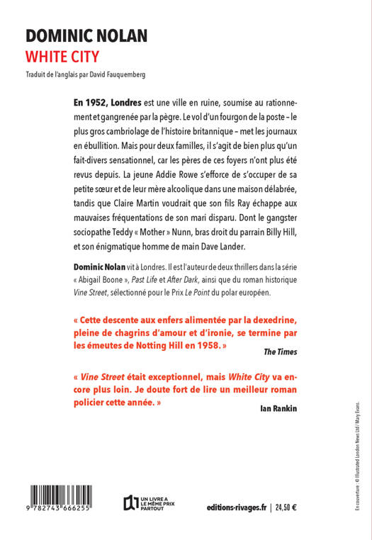 « Cette descente aux enfers alimentée par la dexedrine, pleine de chagrins d'amour et d'ironie, se termine par les émeutes de Notting Hill en 1958. » The Times « Vine Street était exceptionnel, mais White City va encore plus loin. Je doute fort de lire un meilleur roman policier cette année. » Ian Rankin