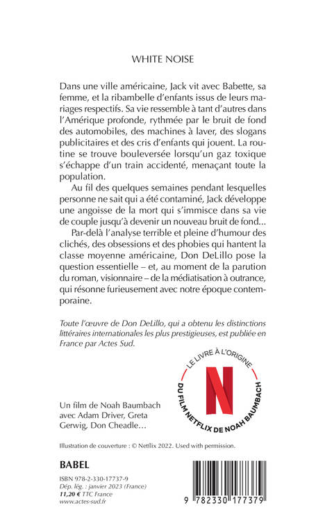 Dans une ville américaine, Jack vit avec Babette, sa femme, et la ribambelle d'enfants issus de leurs mariages respectifs. Sa vie re ssemble à tant d'autres dans l'Amérique profonde, rythmée par le bruit de fond des automobiles, des machines à laver, des slogans publicitaires et des cris d'enfants qui jouent. La routine se trouve bouleversée lorsqu'un gaz toxique s'échappe d'un train accidenté, menaçant toute la population. Au fil des quelques semaines pendant lesquelles personne ne sait qui a été contaminé, Jack développe une angoisse de la mort qui s'immisce dans sa vie de couple jusqu'à devenir un nouveau bruit de fond... Par-delà l'analyse terrible et pleine d'humour des clichés, des obsessions et des phobies qui hantent la classe moyenne américaine, Don DeLillo pose la question essentielle - et, au moment de la parution du roman, visionnaire - de la médiatisation à outrance, qui résonne furieusement avec notre époque contemporaine.