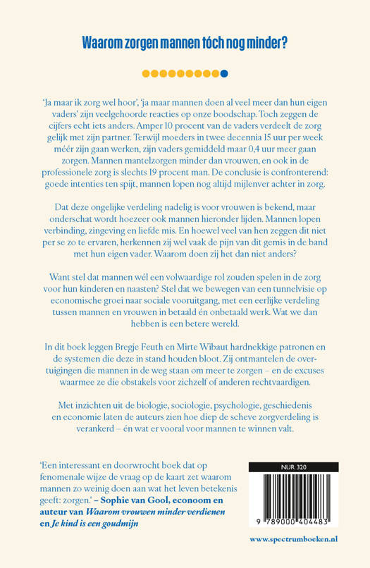 Maar kunnen vrouwen van nature niet ook beter zorgen? Mannen doen toch al heel veel? En is dit nu echt zo’n probleem? Aan de hand van biologie, sociologie en meer verklaren Bregje Feuth en Mirte Wibaut hoe het kan dat mannen – goede intenties ten spijt – nog altijd een stuk minder zorgen. Ze maken je bewust van de valkuilen en laten bovendien zien wat vooral mannen missen. Zorg is namelijk meer dan een last: zorg verbindt en geeft het leven diepe betekenis.
