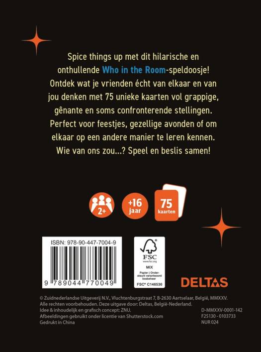 Spice things up met dit hilarische en onthullende Who in the Room-speldoosje! Ontdek wat je vrienden écht van elkaar en van jou denken met 75 unieke kaarten vol grappige, gênante en soms confronterende stellingen. Perfect voor feestjes, gezellige avonden of om elkaar op een andere manier te leren kennen. Wie van ons zou…? Speel en beslis samen!
