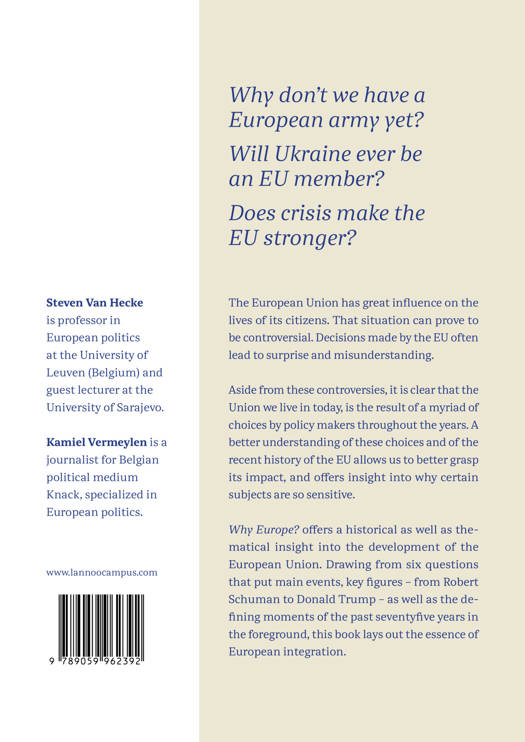 This revised and updated edition of Why Europe? offers a historical as well as thematical insight into the development of the European Union. Will Ukraine ever be an EU member? Why don't we have a European army yet? Does crisis make the EU stronger? The European Union has great influence on the lives of its citizens. That situation can prove to be controversial. Decisions made by the EU often lead to misunderstanding and resentment. Aside from these controversies, it is clear that the Union today, is the result of a myriad of choices by policymakers throughout the years. A better understanding of these choices and of the recent history of the EU allows us to better grasp its impact, and offers insight into why certain subjects are harder to place. This revised and updated edition of