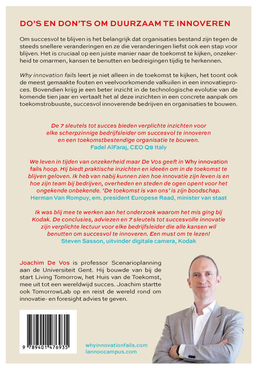 Om succesvol te blijven is het belangrijk dat organisaties bestand zijn tegen de steeds snellere veranderingen en ze die veranderingen liefst ook een stap voor blijven. Het is cruciaal op een juiste manier naar de toekomst te kijken, onzekerheid te omarmen, kansen te benutten en bedreigingen tijdig te herkennen. Why innovation fails leert je niet alleen in de toekomst te kijken, het toont ook de meest gemaakte fouten en veelvoorkomende valkuilen in een innovatieproces. Bovendien krijg je een beter inzicht in de technologische evolutie van de komende tien jaar en vertaalt het al deze inzichten in een concrete aanpak om toekomstrobuuste, succesvol innoverende bedrijven en organisaties te bouwen.