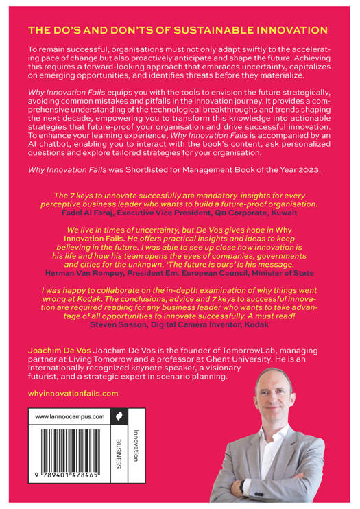 The 7 keys to innovate succesfully are mandatory insights for every perceptive business leader who wants to build a future-proof organisation. - Fadel Al Faraj, Executive Vice President, Q8 Corporate, Kuwait We live in times of uncertainty, but De Vos gives hope in Why Innovation Fails. He offers practical insights and ideas to keep believing in the future. I was able to see up close how innovation is his life and how his team opens the eyes of companies, governments and cities for the unknown. 'The future is ours' is his message. - Herman Van Rompuy, President Em. European Council, Minister of State I was happy to collaborate on the in-depth examination of why things went wrong at Kodak. The conclusions, advice and 7 keys to successful innovation are required reading for any business leader who wants to take advantage of all opportunities to innovate successfully. A must read! - Steven Sasson, Digital Camera Inventor, Kodak