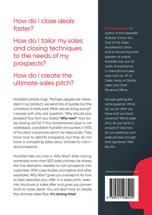 In Why Now? Michael Humblet teaches you how to create the right pitch to maximize your impact and speed up the conversion of prospects into customers. Learn how to tailor sales and closing techniques to the needs of your prospects to formulate the ultimate sales pitch. Humblet's phone rings: 'Michael, people are interested in our product, and we write scores of offers but take-up is poor. What are we doing wrong?' Humblet's reply is invariably: 'Why should a customer buy from you today? Why now?' Sales pitches will fail if this fundamental issue is not addressed, a problem Humblet encounters in 90% of his client companies. They know how to identify prospects, but they do not have a compeling story, tailored to individual prospects. Humblet's clients want to know how to speed up the sales process and close more deals. Humblet tells you how in Why Now? Having optimised more than 500 sales pitches, in Why Now? Humblet shares the five elements needed to turn prospects into customers. With case studies and before and after examples, Why Now? gives you a blueprint for how to best describe your offer in a sales pitch, website, brochure or sales offer and gives you proven tools to close deals. You will learn how to create the ultimate sales flow. It's closing time!