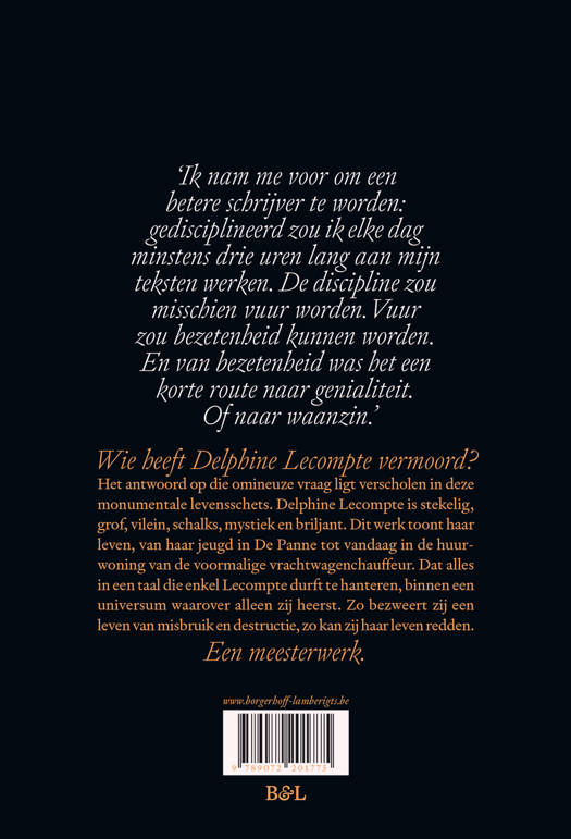 — Bekend als bijna Slimste Mens ter Wereld, en als opmerkelijke opiniemaakster — Niemand schrijft zo ruw, zo eerlijk als Delphine Lecompte — Lecompte behoort tot dé beste literaire stemmen van vandaag ‘Ik nam me voor om een betere schrijver te worden: gedisciplineerd zou ik elke dag minstens drie uren lang aan mijn teksten werken. De discipline zou misschien vuur worden. Vuur zou bezetenheid kunnen worden. En van bezetenheid was het een korte route naar genialiteit. Of naar waanzin.’ Wie heeft Delphine Lecompte vermoord? Het antwoord op die omineuze vraag ligt verscholen in deze monumentale levensschets. Delphine Lecompte is stekelig grof villein schalks mystiek en briljant. Dit werk toont haar leven, van haar jeugd in De Panne tot vandaag in de huurwoning van de voormalige vrachtwagenchauffeur. Dat alles in een taal die enkel Lecompte durft te hanteren, binnen een universum waarover alleen zij heerst. Zo bezweert zij een leven van misbruik en destructie, zo kan zij haar leven redden. Een meesterwerk.