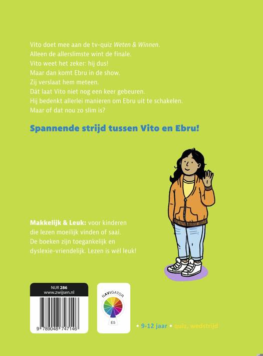 Wie wint de quiz ‘Weet en Win’? Vito natuurlijk! Hij is toch de slimste? De eerste rondes gaat hij ruim aan kop, totdat Ebru in de show komt. Weet zij meer dan hij? Dat zal toch zeker niet? Vito laat het er niet bij zitten en bedenkt slinkse manier om Ebru dwars te zitten. Dit moderne, aansprekende boek op AVI E5 is voor kinderen van 9-12 jaar in de serie ‘Makkelijk & Leuk’, speciaal voor kinderen die lezen moeilijk vinden of saai. Zo krijgen zij weer plezier in lezen. Dyslexievriendelijk!