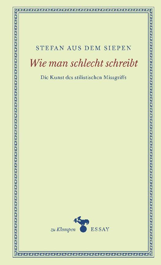Stilkunden beschäftigen sich in der Regel mit dem, was als guter Stil gilt, der schlechte findet allenfalls am Rande Erwähnung. Dabei ist er, statistisch gesehen, viel verbreiteter als der gute und verdiente schon deshalb größere Aufmerksamkeit. Außerdem hat er in seinen mannigfaltigen Erscheinungsformen durchaus eigene, wenn auch meist unbeabsichtigte Reize. Stefan aus dem Siepen nimmt sich ihrer mit der Leidenschaft eines maliziösen Genießers an.Erzählerische Nachlässigkeiten, überfrachtete Sätze, missglückte Anfänge, preziöse Wortwahl, sprachliche Vulgaritäten, schiefe Metaphern, raunende Titel, ungelenke Intimszenen, ... - sämtliche vorgestellten stilistischen Patzer stammen aus den Federn großer Schriftsteller. Selbst diese waren gegen gelegentliche Ausrutscher nicht gefeit. Stefan aus dem Siepen legt mit seiner spiegelverkehrten Stilkunde keine Anthologie pedantisch kompilierter literarischer Fehlgriffe vor, vielmehr erweist er dem Geglückten seine Reverenz. Denn die Reflexionen über das sprachliche Pappmaché handeln immer auch von den edleren Materialien der Literatur.