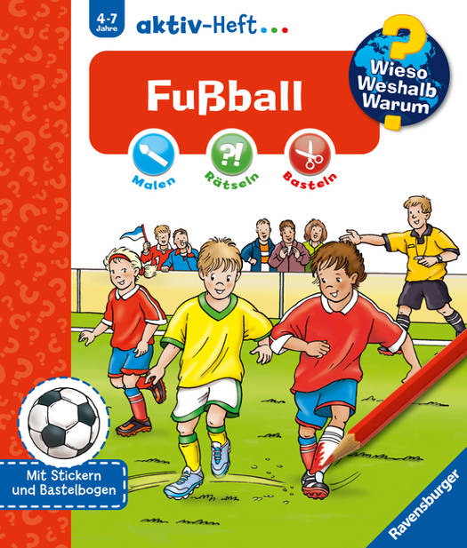 Was braucht man zum Fußballspielen? Wer gehört zur Mannschaft? Spektakuläre Ausmalbilder und Rätsel beantworten diese und andere Fragen rund um den Fußball. Außerdem kann man hier seine eigene Vuvuzela bauen. Mit Bastelbogen und Stickern. Wieso? Weshalb? Warum? aktiv-Heft Malen, Rätseln und Basteln für Kinder von 4-7 Jahren