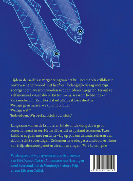 Tijdens de jaarlijkse vergadering van het krill neemt één krilldiertje onverwacht het woord. Het heeft een belangrijke vraag voor zijn soortgenoten. Waarom worden ze door iedereen gegeten, terwijl ze zelf niemand kwaad doen? En trouwens, waarom hebben ze een verzamelnaam? Krill bestaat uit allemaal losse diertjes.