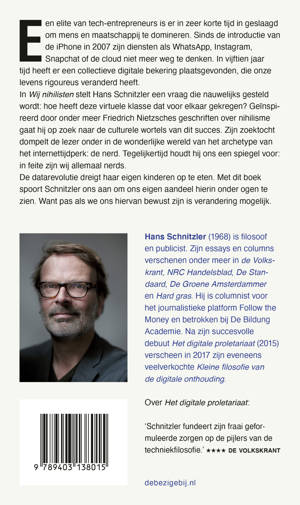 In Wij nihilisten stelt Hans Schnitzler een vraag die nauwelijks gesteld wordt: hoe heeft deze virtuele klasse dat voor elkaar gekregen? Geïnspireerd door onder andere Friedrich Nietzsches geschriften over nihilisme gaat hij op zoek naar de culturele wortels van dit succes. Zijn zoektocht dompelt de lezer onder in de wonderlijke wereld van het archetype van het internettijdperk: de nerd. Tegelijkertijd houdt hij ons een wrange spiegel voor: in feite zijn wij allemaal nerds.