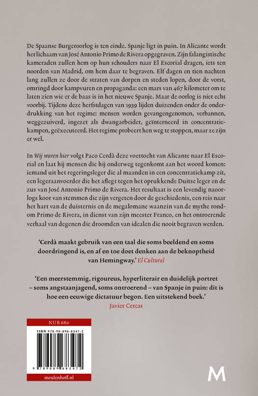 In Wij waren hier volgt Paco Cerdà deze voettocht van Alicante naar El Escorial en geeft hij het woord aan de mensen die hij onderweg tegenkomt; iemand uit het regeringsleger die al maanden in een concentratiekamp zit, een legeraanvoerder die het aflegt tegen het oprukkende Duitse leger en de zus van Antonio Primo de Rivera.