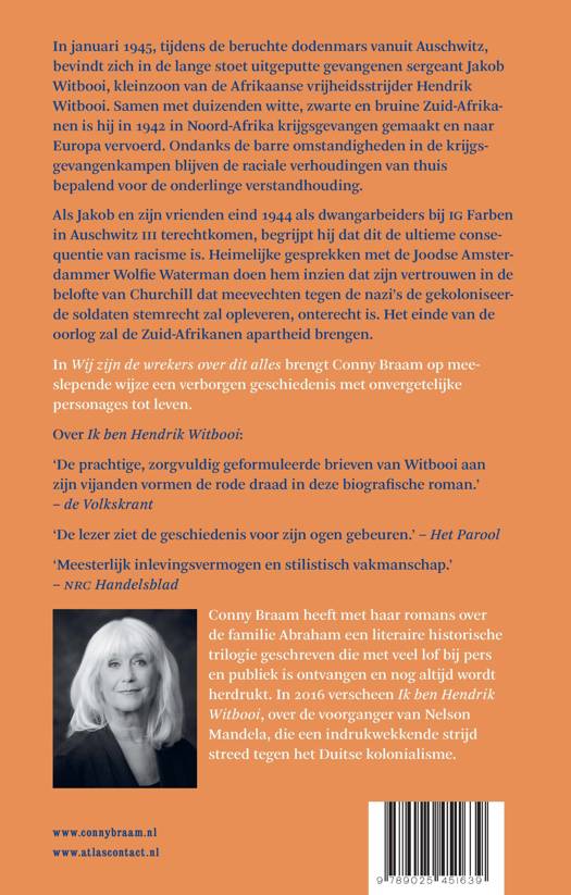 'Wij zijn de wrekers over dit alles' van Conny Braam beschrijft hoe 75 jaar geleden tijdens de dodenmars vanuit Auschwitz een lange stoet uitgeputte gevangenen, onder wie sergeant Jakob Witbooi, kleinzoon van de Afrikaanse vrijheidsstrijder Hendrik Witbooi, naar het westen trekt. Samen met duizenden witte, zwarte en bruine Zuid-Afrikanen is hij in 1942 in Noord-Afrika krijgsgevangen gemaakt en naar Europa vervoerd. Ondanks de barre omstandigheden in de krijgsgevangenkampen blijven de raciale verhoudingen van thuis bepalend voor de onderlinge verstandhouding. Als Jakob en zijn vrienden eind 1944 als dwangarbeiders bij IG Farben in Auschwitz III terechtkomen, begrijpt hij dat dit de ultieme consequentie van racisme is. Heimelijke gesprekken met de Joodse Amsterdammer Wolfie Waterman doen hem inzien dat zijn vertrouwen in de belofte van Churchill dat meevechten tegen de nazi's de gekoloniseerde soldaten stemrecht zal opleveren, onterecht is. Het einde van de oorlog zal de Zuid-Afrikanen apartheid brengen.