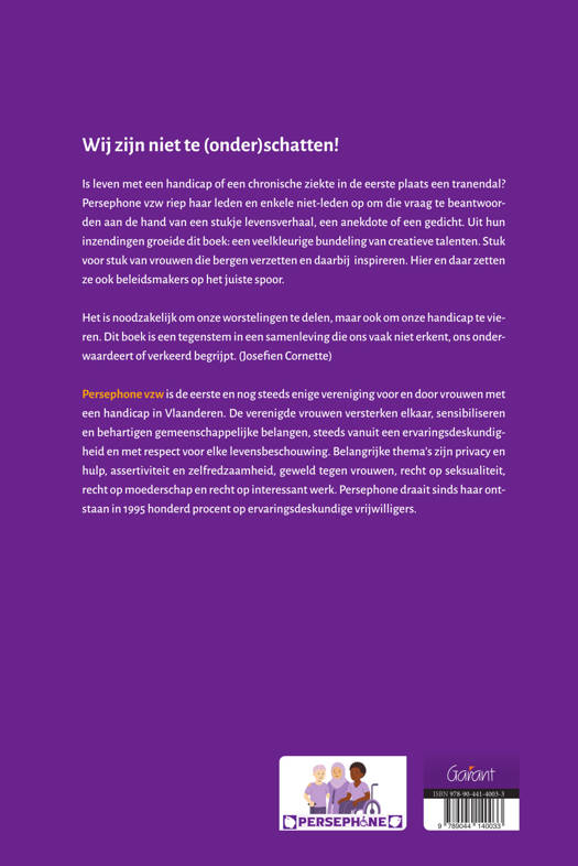 Het is noodzakelijk om onze worstelingen te delen, maar ook om onze handicap te vieren. Dit boek is een tegenstem in een samenleving die ons vaak niet erkent, ons onderwaardeert of verkeerd begrijpt. (Josefien Cornette) Persephone vzw is de eerste en nog steeds enige vereniging voor en door vrouwen met een handicap in Vlaanderen. De verenigde vrouwen versterken elkaar, sensibiliseren en behartigen gemeenschappelijke belangen, steeds vanuit een ervaringsdeskundigheid en met respect voor elke levensbeschouwing. Belangrijke thema’s zijn privacy en hulp, assertiviteit en zelfredzaamheid, geweld tegen vrouwen, recht op seksualiteit, recht op moederschap en recht op interessant werk. Persephone draait sinds haar ontstaan in 1995 honderd procent op ervaringsdeskundige vrijwilligers.