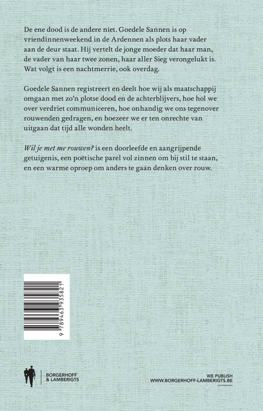 Goedele Sannen is op vriendinnenweekend in de Ardennen als plots haar vader aan de deur staat. Hij vertelt de jonge moeder dat haar man, de vader van haar twee zonen, haar aller Sieg verongelukt is. Wat volgt, is een nachtmerrie, ook overdag. Goedele Sannen registreert en deelt hoe wij als maatschappij omgaan met zo’n plotse dood en de achterblijvers, hoe hol en onhandig we over verdriet communiceren, hoe alleen we rouwenden laten, en hoezeer we er ten onrechte van uitgaan dat tijd alle wonden heelt.