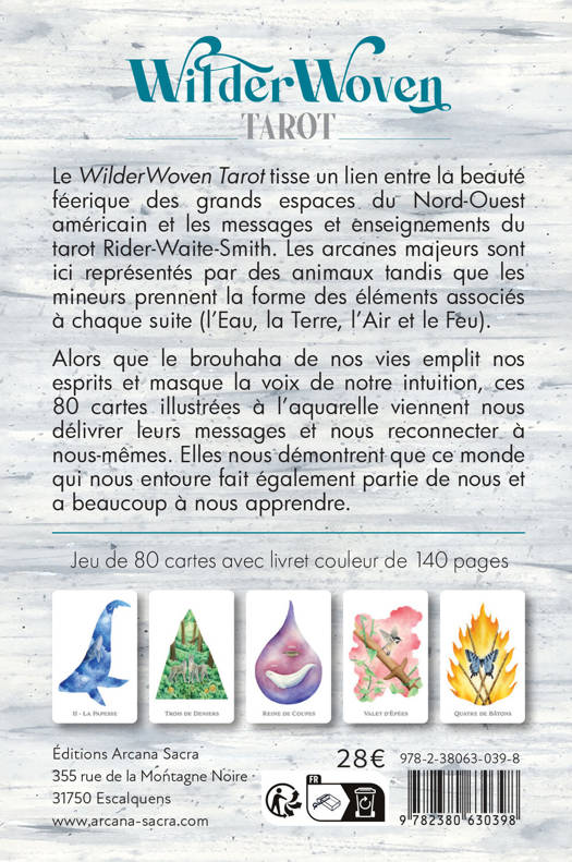Le « WilderWoven Tarot » tisse un lien entre la beauté féerique des grands espaces du Nord-Ouest américain et les messages et enseignements du tarot Rider-Waite-Smith. Les arcanes majeurs sont ici représentés par des animaux tandis que les mineurs prennent la forme des éléments associés à chaque suite (l’Eau, la Terre, l’Air et le Feu). Alors que le brouhaha de nos vies emplit nos esprits et masque la voix de notre intuition, ces 80 cartes illustrées à l’aquarelle viennent nous délivrer leurs messages et nous reconnecter à nous-mêmes. Elles nous démontrent que ce monde qui nous entoure fait également partie de nous et a beaucoup à nous apprendre.