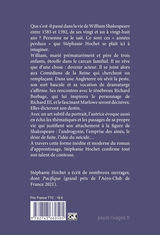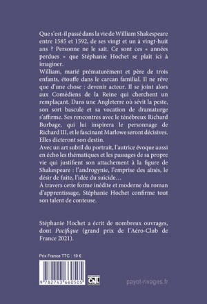Que s'est-il passé dans la vie de William Shakespeare entre 1585 et 1592, de ses vingt et un à vingt-huit ans ? Personne ne le sait. Ce sont ces « années perdues » que Stéphanie Hochet se plaît ici à imaginer. William, marié prématurément et père de trois enfants, étouffe dans le carcan familial. Il ne rêve que d'une chose : devenir acteur. Il se joint alors aux Comédiens de la Reine qui cherchent un remplaçant. Dans une Angleterre où sévit la peste, son sort bascule et sa vocation de dramaturge s'affirme. Ses rencontres avec le ténébreux Richard Burbage, qui lui inspirera le personnage de Richard III, et le fascinant Marlowe seront décisives. Elles dicteront son destin. Avec un art subtil du portrait, l'autrice évoque aussi en écho les thématiques et les passages de sa propre vie qui justifient son attachement à la figure de Shakespeare : l'androgynie, l'emprise des aînés, le désir de fuite, l'idée du suicide... À travers cette forme inédite et moderne du roman d'apprentissage, Stéphanie Hochet confirme tout son talent de conteuse.