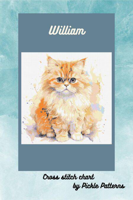 This cross stitch chart is a whimsical design of an orange kitten with a watercolour appearance.