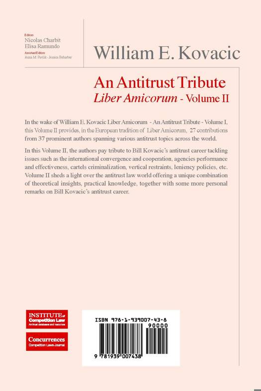In the wake of William E. Kovacic Liber Amicorum - An Antitrust Tribute - Volume I, this Volume II provides, in the European tradition of Liber Amicorum, 27 contributions from 37 prominent authors spanning various antitrust topics across the world. In this Volume II, the authors pay tribute to Bill Kovacic's antitrust career tackling issues such as the international convergence and cooperation, agencies performance and effectiveness, cartels criminalization, vertical restraints, leniency policies, etc. Volume II sheds a light over the antitrust law world offering a unique combination of theoretical insights, practical knowledge, together with some more personal remarks on Bill Kovacic's antitrust career.