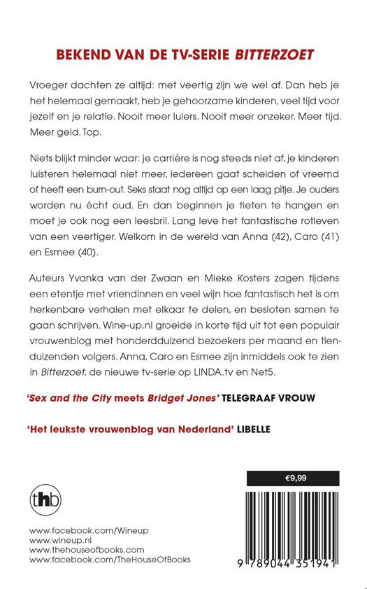 Vroeger dachten ze altijd: met veertig zijn we af. Dan heb je het helemaal gemaakt, heb je gehoorzame kinderen, veel tijd voor jezelf en je relatie. Nooit meer luiers. Nooit meer onzeker. Meer tijd. Meer geld. Top. Niets blijkt minder waar: je carrière is nog steeds niet af, je kinderen luisteren helemaal niet meer, iedereen gaat scheiden of vreemd of heeft een burn-out. Seks staat nog altijd op een laag pitje. Je ouders worden nu écht oud. En dan beginnen je tieten te hangen en moet je ook nog een leesbril. Lang leve het fantastische rotleven van een veertiger. Welkom in de wereld van Anna (42), Caro (41) en Esmee (40).