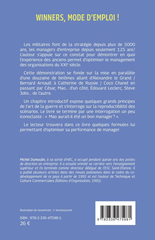 Les militaires font de la stratégie depuis plus de 5000 ans, les managers d’entreprise depuis seulement 125 ans ! L’auteur s’appuie sur ce constat pour démontrer en quoi l’expérience des anciens permet d’optimiser le management des organisations du XXIe siècle. Cette démonstration se fonde sur la mise en parallèle d’une douzaine de binômes allant d’Alexandre le Grand/Bernard Arnault à Catherine de Russie/Coco Channel en passant par César, Mao... d’un côté, Édouard Leclerc, Steve Jobs... de l’autre. Un chapitre introductif expose quelques grands principes de l’art de la guerre et s’interroge sur la reproductibilité des scénarios. Le livre se termine par une interrogation un peu iconoclaste : « Mao aurait-il été un bon manager ? ». Le lecteur trouvera dans ce livre quelques formules lui permettant d’optimiser sa performance de manager.