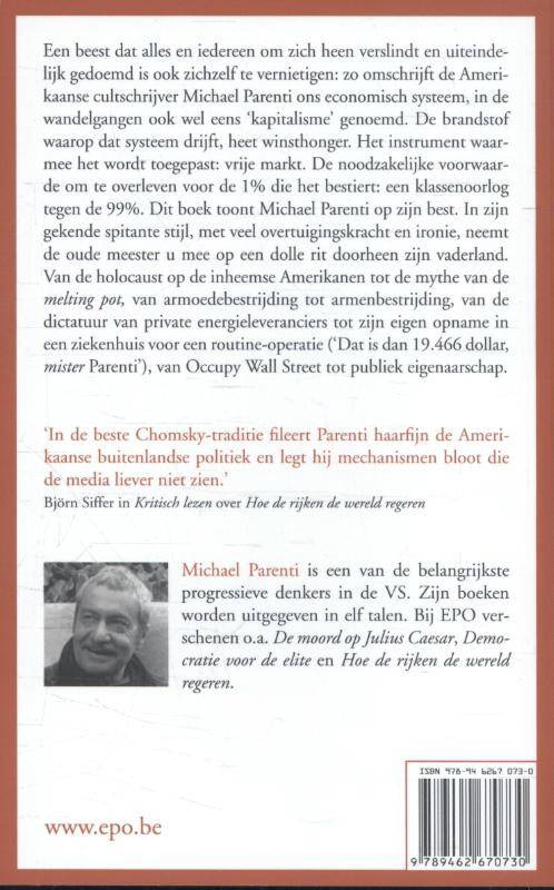 Een beest dat alles en iedereen om zich heen verslindt en uiteindelijk gedoemd is ook zichzelf te vernietigen: zo omschrijft de Amerikaanse cultschrijver Michael Parenti ons economisch systeem, in de wandelgangen ook wel eens ‘kapitalisme’ genoemd. De brandstof waarop dat systeem drijft, heet winsthonger. Het instrument waarmee het wordt toegepast: vrije markt. De noodzakelijke voorwaarde om te overleven voor de 1% die het bestiert: een klassenoorlog tegen de 99%. Dit boek toont Michael Parenti op zijn best. In zijn gekende spitante stijl, met veel overtuigingskracht en ironie, neemt de oude meester u mee op een dolle rit doorheen zijn vaderland. Van de holocaust op de inheemse Amerikanen tot de mythe van de melting pot, van armoedebestrijding tot armenbestrijding, van de dictatuur van private energieleveranciers tot zijn eigen opname in een ziekenhuis voor een routine-operatie (‘Dat is dan 19.466 dollar, mister Parenti’), van Occupy Wall Street tot publiek eigenaarschap.