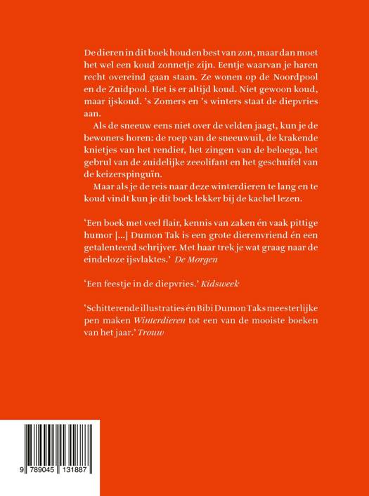 Bibi Dumon Tak is niet voor niets de koningin van de dierenboeken voor kinderen. In schitterende, speelse taal maakt ze gewone dieren bijzonder en brengt ze onbekende dieren dichtbij. In Winterdieren laat ze ons kennismaken met de bewoners van de Noord- en Zuidpool, in al hun ijskoude schoonheid geïllustreerd door Martijn van der Linden. Een verfrissende ontdekkingstocht.