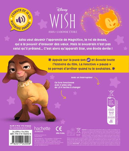– Un livre illustré de 24 pages, pour découvrir l’histoire complète du film. – Une puce sonore de 5 minutes pour entendre l’histoire et savoir quand tourner la page grâce au son de clochette. – La fonction pause permet d’arrêter et de reprendre la narration ! – Le bouton ON/OFF au dos du livre permet d’éteindre et d’allumer à volonté pour reprendre la lecture depuis le début.