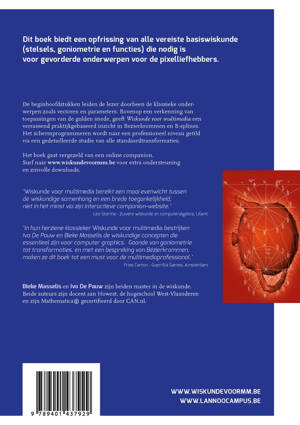 Dit boek biedt een opfrissing van alle vereiste basiswiskunde (stelsels, goniometrie en functies) die nodig is voor gevorderde onderwerpen voor de pixelliefhebbers. De beginhoofdstukken leiden de lezer doorheen de klassieke onderwerpen zoals vectoren en parameters. Bovenop een verkenning van toepassingen van de gulden snede, geeft Wiskunde voor multimedia een verrassend praktijkgebaseerd inzicht in Bezierkrommen en B-splines. Het schermprogrammeren wordt naar een professioneel niveau getild via een gedetailleerde studie van alle standaardtransformaties. Het boek gaat vergezeld van een online companion. 'Wiskunde voor multimedia bereikt een mooi evenwicht tussen de wiskundige samenhang en een brede toegankelijkheid, niet in het minst via zijn interactieve companion-website.' Leo Storme - Zuivere wiskunde en computeralgebra, UGent 'In hun herziene klassieker Wiskunde voor multimedia bestrijken Ivo De Pauw en Bieke Masselis de wiskundige concepten die essentieel zijn voor computer graphics. Gaande van goniometrie tot transformaties, en met een bespreking van Bézierkrommen, maken ze dit boek tot een must voor de multimediaprofessional.' Fries Carton - Guerrilla Games, Amsterdam