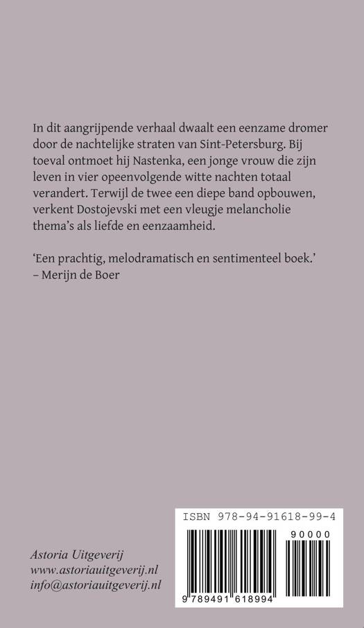 In dit aangrijpende verhaal dwaalt een eenzame dromer door de nachtelijke straten van Sint-Petersburg. Bij toeval ontmoet hij Nastenka, een jonge vrouw die zijn leven in vier opeenvolgende witte nachten totaal verandert. Terwijl de twee een diepe band opbouwen, verkent Dostojevski met een vleugje melancholie thema’s als liefde en eenzaamheid.