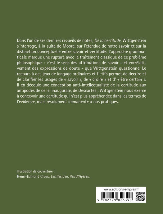 Dans l'un de ses derniers recueils de notes, De la certitude, Wittgenstein s'interroge, à la suite de Moore, sur l'étendue de notre savoir et sur la distinction conceptuelle entre savoir et certitude. L'approche grammaticale marque une rupture avec le traitement classique de ce problème philosophique : c'est le sens des attributions de savoir - et corrélativement des expressions de doute - que Wittgenstein questionne. Le recours à des jeux de langage ordinaires et fictifs permet de décrire et de clarifier les usages de "savoir", de "croire" et d' "être certain". Il en découle une conception anti-intellectualiste de la certitude aux antipodes de celle, inaugurale, de Descartes : Wittgenstein nous exerce à concevoir une certitude qui n'est plus appréhendée dans les termes de l'évidence, mais résolument immanente à nos pratiques.