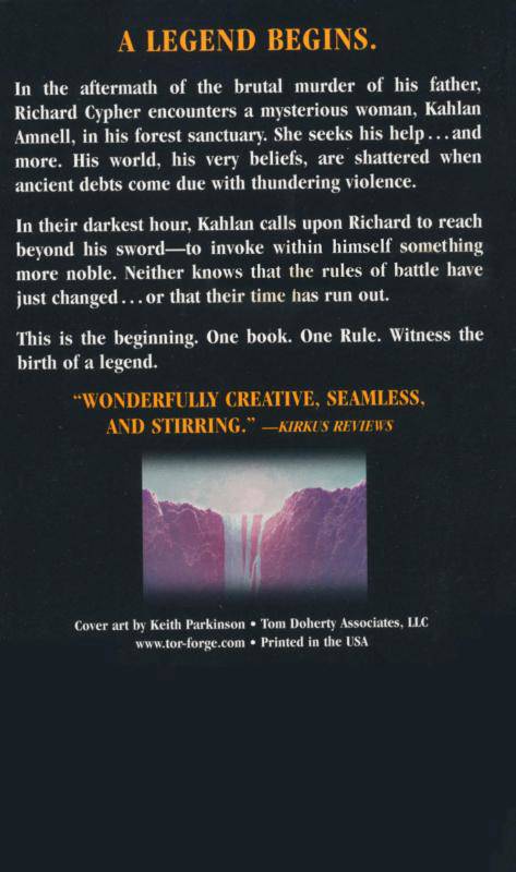 In the aftermath of the brutal murder of his father, a mysterious woman, Kahlan Amnell, appears in Richard Cypher's forest sanctuary seeking help . . . and more. His world, his very beliefs, are shattered when ancient debts come due with thundering violence.