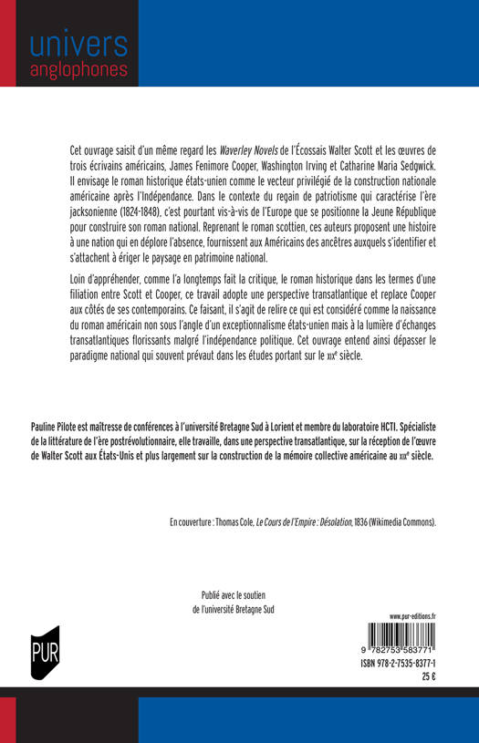 Cet ouvrage saisit d'un même regard les Waverley Novels de l'Écossais Walter Scott et les oeuvres de trois écrivains américains, James Fenimore Cooper, Washington Irving et Catharine Maria Sedgwick. Il envisage le roman historique états-unien comme le vecteur privilégié de la construction nationale américaine après l'Indépendance. Dans le contexte du regain de patriotisme qui caractérise l'ère jacksonienne (1824-1848), c'est pourtant vis-à-vis de l'Europe que se positionne la Jeune République pour construire son roman national. Reprenant le roman scottien, ces auteurs proposent une histoire à une nation qui en déplore l'absence, fournissent aux Américains des ancêtres auxquels s'identifier et s'attachent à ériger le paysage en patrimoine nationalut dans les études portant sur le XIXe siècle.