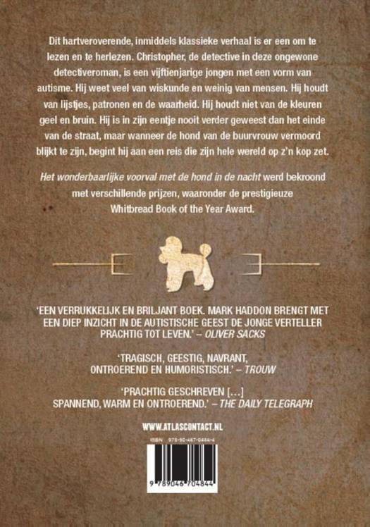 'Het wonderbaarlijke voorval met de hond in de nacht' van Mark Haddon is het hartveroverende, inmiddels klassieke verhaal om te lezen en te herlezen. Christopher, de detective in deze ongewone detectiveroman, is een vijftienjarige jongen met een vorm van autisme. Hij weet veel van wiskunde en weinig van mensen. Hij houdt van lijstjes, patronen en de waarheid. Hij houdt niet van de kleuren geel en bruin. Hij is in zijn eentje nooit verder geweest dan het einde van de straat, maar wanneer de hond van de buurvrouw vermoord blijkt te zijn, begint hij aan een reis die zijn hele wereld op z'n kop zet.