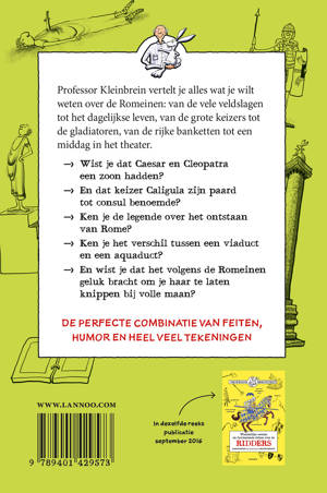 De perfecte combinatie van feiten, humor en heel veel tekeningen Professor Kleinbrein vertelt je alles wat je wilt weten over de Romeinen: van de vele veldslagen tot het dagelijkse leven, van de grote keizers tot de gladiatoren, van de rijke banketten tot een middag in het theater. Wist je dat Caesar en Cleopatra een zoon hadden? En dat keizer Caligula zijn paard tot consul benoemde? Ken je de legende over het ontstaan van Rome? Ken je het verschil tussen een viaduct en een aquaduct? En wist je dat het volgens de Romeinen geluk bracht om je haar te laten knippen bij volle maan?
