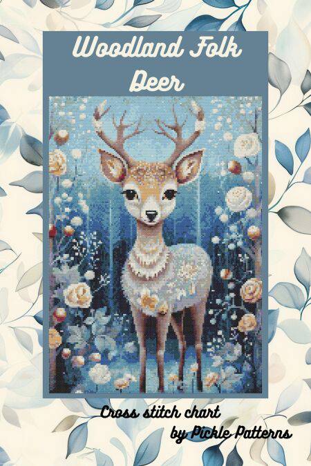 This cross stitch chart is a whimsical design of a deer with a cute costume in a folk art woodland setting.