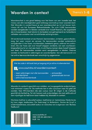 Woordenschat is van groot belang voor het leren van een tweede taal: het niveau van alle vaardigheden gaat omhoog naarmate de taalleerder meer woorden kent. Met de nieuwe uitgave Woorden in context bouwen cursisten een woordenschat op tot net boven taalniveau A2 van het Europees Referentiekader. De ruim 2300 leerwoorden worden aangeboden in teksten verdeeld over twaalf thema’s, die opgedeeld zijn in twee boeken. De leerwoorden worden systematisch aangeboden in vier fases: voorbewerken, semantiseren, consolideren en controleren. Veel teksten in de boeken zijn geïnspireerd op de verhalen van cursisten met verschillende achtergronden. Daardoor is de betekenisvolle context herkenbaar voor iedere taalleerder die een nieuw leven begint in Nederland.