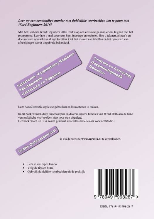 Met het Lesboek Word Beginners 2016 leert u op een eenvoudige manier om te gaan met het programma. Leer hoe u snel gegevens kunt invoeren en ordenen. Hoe u teksten, alinea's en documenten opmaakt in al zijn facetten. Ook het maken van tabellen en het opnemen van afbeeldingen wordt uitgebreid behandeld.