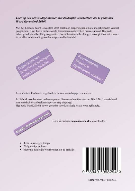 Met het Lesboek Word Gevorderd 2016 leert u op dieper ingaan op alle mogelijkheden van het programma. Leer hoe u professionele formulieren ontwerpt en macro's maakt. Hoe u de achtergrond van afbeelding weghaalt en hoe u SmartArt afbeeldingen invoegt. Ook het rekenen in tabellen en de mailing worden uitgevoerd behandeld.