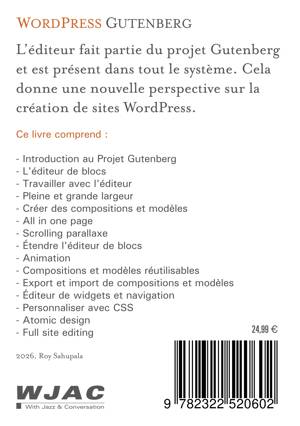 Ce livre explique également comment créer des blocs de mise en page. Comment créer une "All in One Page" (page tout-en-un). Comment appliquer le défilement Parallaxe. Comment étendre l'éditeur avec des plugins. Comment appliquer l'animation. Comment créer des blocs réutilisables, des compositions et des modèles. Travailler avec le nouvel éditeur de navigation et de widgets. Comment styliser les blocs avec CSS. Et comment personnaliser un thème en utilisant Gutenberg avec un éditeur de site.