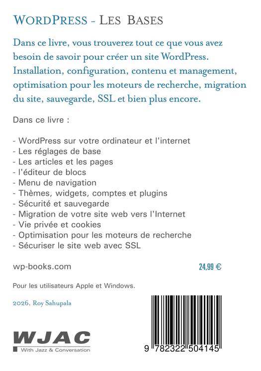 Ce livre décrit comment installer et configurer un site WordPress. Vous découvrirez le tableau de bord (l'environnement de gestion). Ensuite, vous créerez du contenu avec des articles et des pages. Vous apprendrez également à créer un menu de navigation et un menu social, ainsi qu'à installer et à personnaliser un thème.