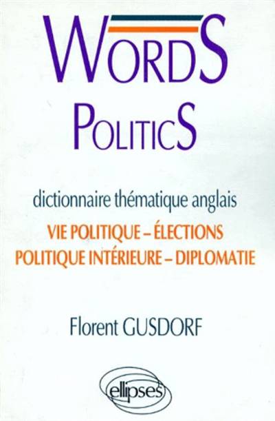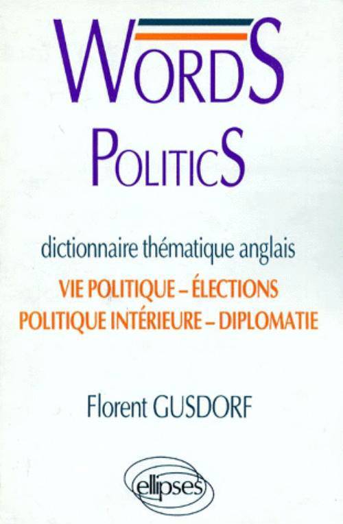 WORDS POLITICS est l'outil indispensable pour tous ceux qui, de l'étudiant à l'homme politique, sont soucieux d'acquérir le vocabulaire fondamental de la langue politique. Il s'adresse aux élèves des classes préparatoires, aux élèves des Instituts d'Études politiques (I.E.P.), des Instituts de Journalisme, et aux étudiants de DEUG ; il s'adresse également aux élèves des classes Terminales curieux du vocabulaire particulier du monde politique ; enfin, il est destiné à tous ceux qui se préparent à une carrière dans la fonction civile ou la diplomatie. Moderne et exhaustif, WORDS POLITICS traite de tous les grands sujets au cœur de la politique contemporaine. La première partie est consacrée à la vie politique et aux institutions, la seconde aux élections, la troisième à la politique intérieure, alors que la quatrième traite de la diplomatie et des relations internationales.
