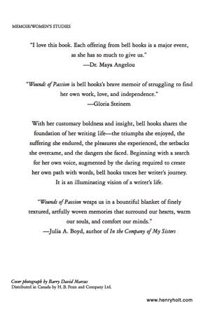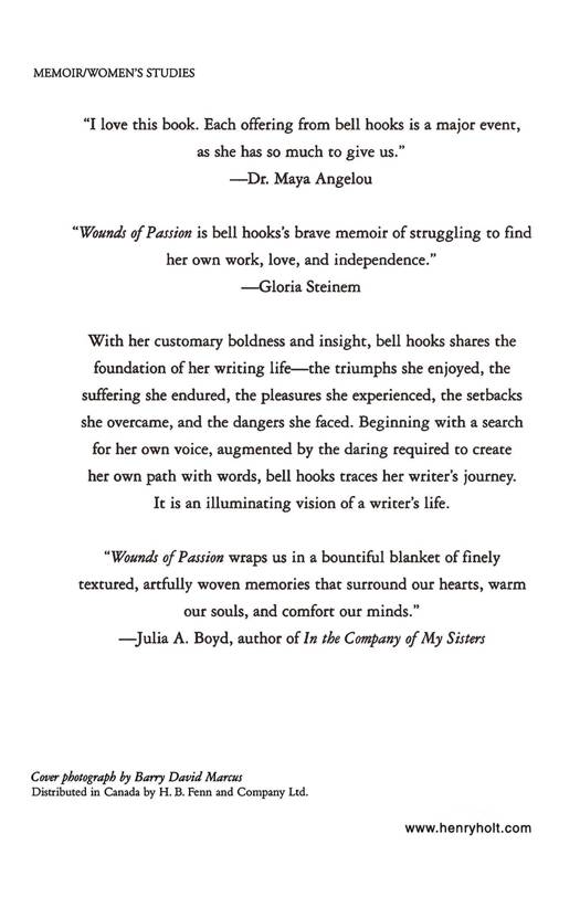With her customary boldness and insight, brilliant social critic and public intellectual bell hooks traces her writer's journey in Wounds of Passion. She shares the difficulties and triumphs, the pleasures and the dangers, of a life devoted to writing. hooks lets readers see the ways one woman writer can find her own voice while forging relationships of love in keeping with her feminist thinking. With unflinching courage and hard-won wisdom, hooks reveals the intimate details and provocative ideas of the life path she carved out of words, lighting the way for all writers who would tread in her wake.
