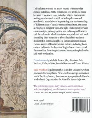 This book comprises six essays by prominent scholars of medieval Insular manuscripts. The main emphasis is on the physical appearance of books, though writing on and in other objects is also discussed. The essays highlight, in different ways, the tight relationship between the palaeographical and codicological features of manuscripts and the culture in which the objects were produced and used. Extending their expertise to a broad audience interested in the medieval book, the contributors discuss various aspects of written culture, including the development of Insular scripts, book culture in Mercia, the layout of Anglo-Saxon charters, and the transition from Anglo-Saxon to Norman-inspired script and book production. Contributions by Michelle Brown, David Dumville, Mary Garrison, Kathryn Lowe, Francis Newton and Teresa Webber.