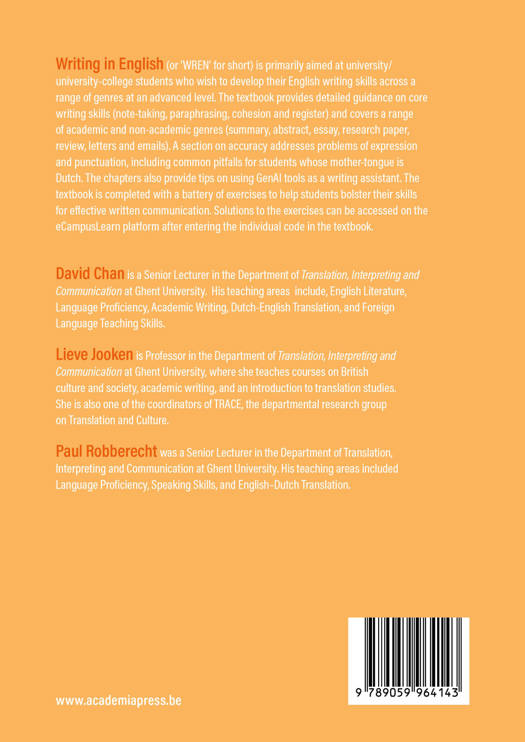 Writing in English (or ‘WREN’ for short) is primarily aimed at university/university-college students who wish to develop their English writing skills across a range of genres at an advanced level. The textbook provides detailed guidance on core writing skills (note-taking, paraphrasing, cohesion and register) and covers a range of academic and non-academic genres (summary, abstract, essay, research paper, review, letters and emails). A section on accuracy addresses problems of expression and punctuation, including common pitfalls for students whose mother-tongue is Dutch. The chapters also provide tips on using GenAI tools as a writing assistant. The textbook is completed with a battery of exercises to help students bolster their skills for effective written communication. Solutions to the exercises can be accessed on the eCampusLearn platform after entering the individual code in the textbook.